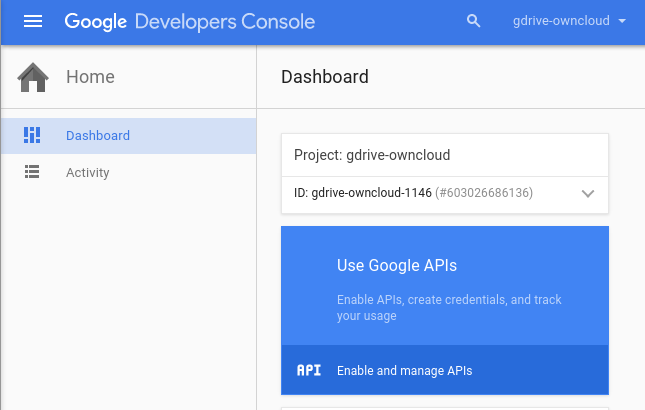Google helpfully highlights your next step in blue, the Use Google APIs box. Make sure that your new project is selected, click on Use Google APIs , and it takes you to Google’s APIs screen. There are many Google APIs; look for the Google Apps APIs and click Drive API.