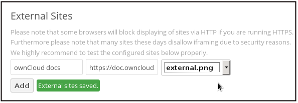 The External sites app is included in all versions of ownCloud. Go to Apps > Not Enabled to enable it. Then go to your ownCloud Admin page to create your links, which are saved automatically. There is a dropdown menu to select an icon, but there is only one default icon so you don’t have to select one. Hover your cursor to the right of your links to make the trashcan icon appear when you want to remove them.